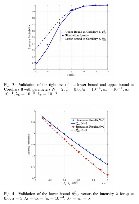 Abstract: The secure transmission of confidential information in cellular vehicle-to-everything (C-V2X) communication networks is vitally important for user’s personal safety. However, for C-V2X, there have not been many studies on the physical layer security (PLS). Since artificial noise (AN) and secure beamforming are popular PLS techniques for cellular communications, in this paper we investigate the potential of these PLS techniques for enhancing the security of C-V2X networks. In particular, leveraging stochastic geometry, we study the PLS of an AN assisted C-V2X network, where the locations of legitimate vehicular nodes, malicious vehicular nodes and road side units (RSUs) are modeled by Cox processes driven by a common Poisson line process (PLP), and the locations of cellular base stations (BSs) are modeled by a two-dimensional (2D) Poisson point process (PPP). Based on the maximum signal-to-interference-ratio (SIR) association scheme, we calculate the coverage probability of the network. We also derive bounds on the secrecy probability, which are validated by simulation results. Moreover, we obtain an analytical result of the effective secrecy throughput for characterizing the reliability and security of wiretap channels. Simulation results are given to validate the analytical result, and provide interesting insights into the impact of network parameters on the achievable secrecy performance. Simulation results show that a larger array antenna can provide a better robustness of the secure transmission strategy, and the optimal power allocation ratio between confidential information and AN remains almost unchanged for different numbers of antennas.