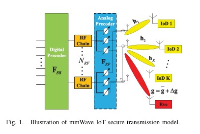 The paper proposes a robust hybrid precoding scheme for securing mmWave IoT networks under secrecy outage constraints. It maximizes the minimum secrecy rate among IoT devices by jointly optimizing analog and digital precoders using the PDD method, achieving significant performance gains.